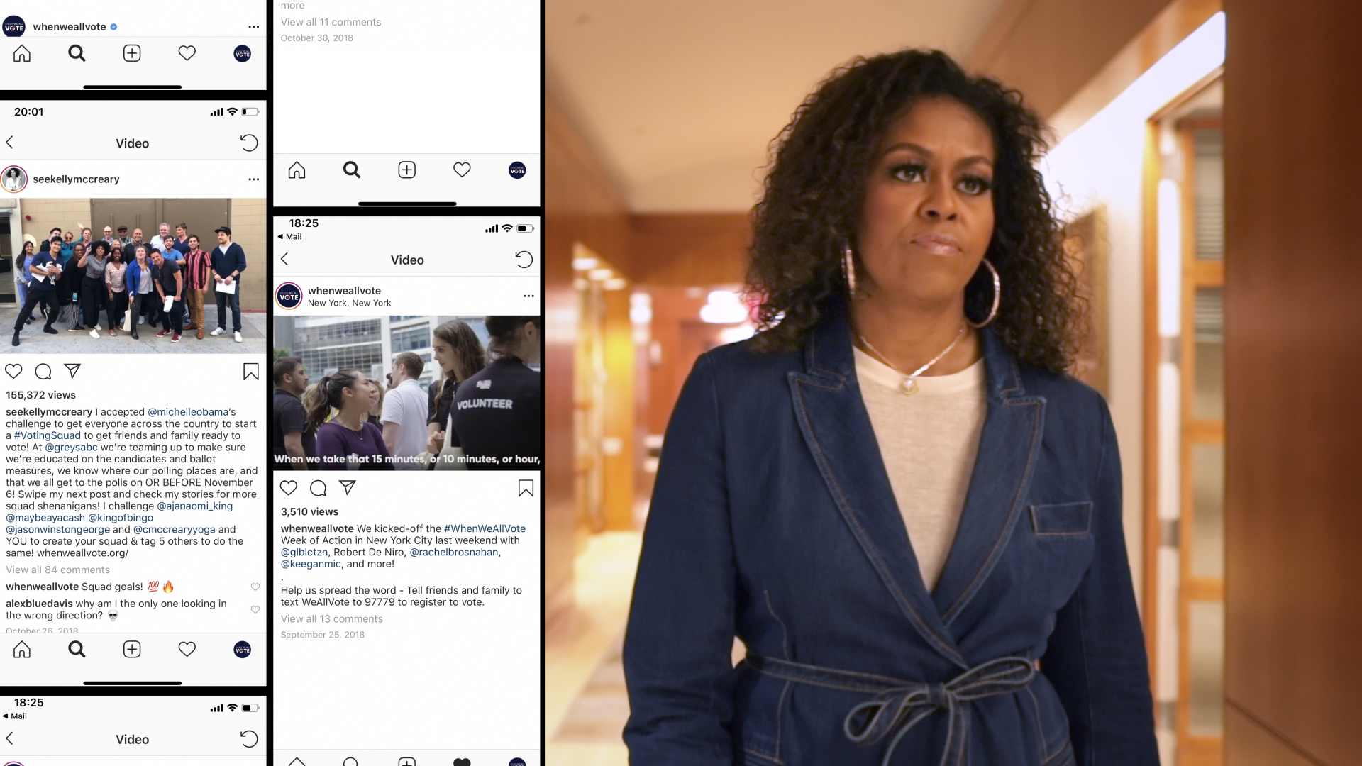 A transition developed to help the audience grasp the vast reach of the When We All Vote mission. In this sequence Michelle Obama slides into an Instagram post, at the same time WWAV Co-Chairs and Volunteers populate the screen with their posts.